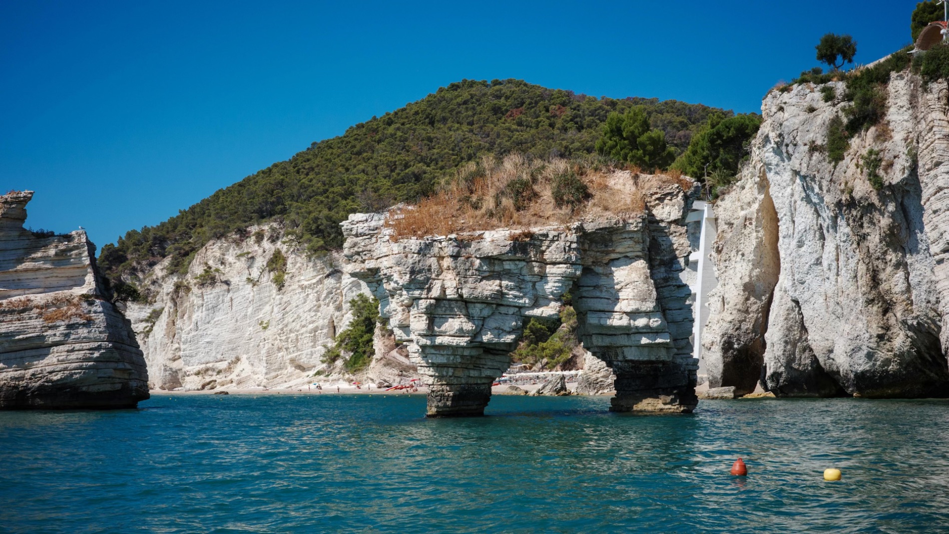 An der Gargano-Küste liegt die Baia delle Zagare, ein echtes Juwel mit weißen Kalksteinfelsen, einzigartigen Felsformationen und tiefblauem Wasser.